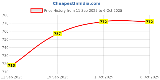 The current price is ₹772, which is ₹54 (7.5%) higher than the best price of ₹718 last seen on 11 Sep 2025. Over the 24 day price history period, prices have ranged from ₹718 to ₹772, with an average of ₹755. The pricing has been quite stable with low volatility, but the overall trend is concerning as prices are getting more expensive. In terms of recent activity, there have been 0 price changes this week, 2 this month, and 2 over the past year. If you need this product now, it's a reasonable time to buy as prices are stable, but you might want to monitor for potential better deals.