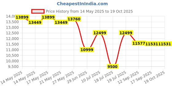 The current price is ₹11,531, which is ₹2,031 (21.4%) higher than the best price of ₹9,500 last seen on 18 Jul 2025. Over the 157 day price history period, prices have ranged from ₹9,500 to ₹13,899, with an average of ₹12,383. The pricing shows moderate volatility, and the overall trend is favorable for consumers as prices are getting cheaper. In terms of recent activity, there have been 0 price changes this week, 0 this month, and 10 over the past year. If you need this product now, it's a reasonable time to buy as prices are stable, but you might want to monitor for potential better deals.