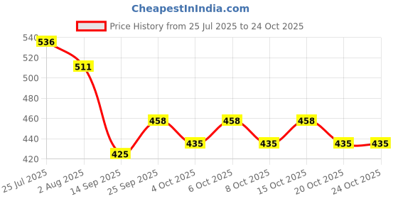 The current price is ₹435, which is ₹10 (2.4%) higher than the best price of ₹425 last seen on 14 Sep 2025. Over the 91 day price history period, prices have ranged from ₹425 to ₹536, with an average of ₹459. The pricing shows moderate volatility, and the overall trend is favorable for consumers as prices are getting cheaper. In terms of recent activity, there have been 0 price changes this week, 5 this month, and 8 over the past year. If you need this product now, it's a reasonable time to buy as prices are stable, but you might want to monitor for potential better deals.