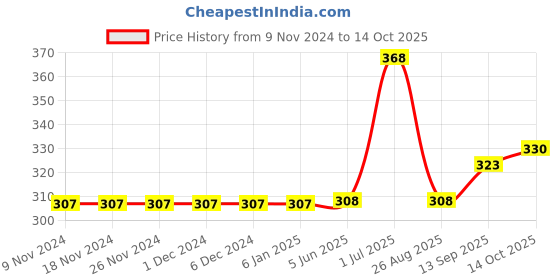 The current price is ₹330, which is ₹23 (7.5%) higher than the best price of ₹307 last seen on 9 Nov 2024. Over the 339 day price history period, prices have ranged from ₹307 to ₹368, with an average of ₹316. The pricing shows moderate volatility, but the overall trend is concerning as prices are getting more expensive. In terms of recent activity, there have been 0 price changes this week, 0 this month, and 10 over the past year. If you need this product now, it's a reasonable time to buy as prices are stable, but you might want to monitor for potential better deals.