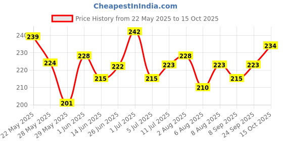 The current price is ₹234, which is ₹33 (16.4%) higher than the best price of ₹201 last seen on 29 May 2025. Over the 146 day price history period, prices have ranged from ₹201 to ₹242, with an average of ₹223. The pricing has been quite stable with low volatility, with prices remaining relatively stable overall. In terms of recent activity, there have been 0 price changes this week, 1 this month, and 14 over the past year. If you need this product now, it's a reasonable time to buy as prices are stable, but you might want to monitor for potential better deals.
