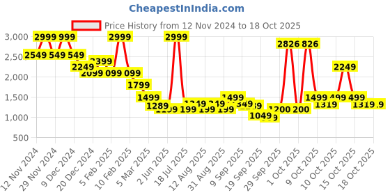 The current price is ₹1,319, which is ₹330 (33.4%) higher than the best price of ₹989 last seen on 22 Sep 2025. Over the 340 day price history period, prices have ranged from ₹989 to ₹2,999, with an average of ₹1,827. The pricing shows high volatility with significant fluctuations, and the overall trend is favorable for consumers as prices are getting cheaper. In terms of recent activity, there has been 1 price change this week, 11 this month, and 35 over the past year. This is an excellent time to make a purchase as prices are trending downward and conditions appear favorable.