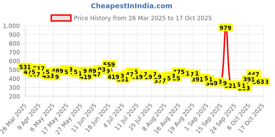 The current price is ₹363, which is ₹70 (23.9%) higher than the best price of ₹293 last seen on 1 Oct 2025. Over the 204 day price history period, prices have ranged from ₹293 to ₹979, with an average of ₹441. The pricing shows high volatility with significant fluctuations, and the overall trend is favorable for consumers as prices are getting cheaper. In terms of recent activity, there has been 1 price change this week, 7 this month, and 50 over the past year. If you need this product now, it's a reasonable time to buy as prices are stable, but you might want to monitor for potential better deals.