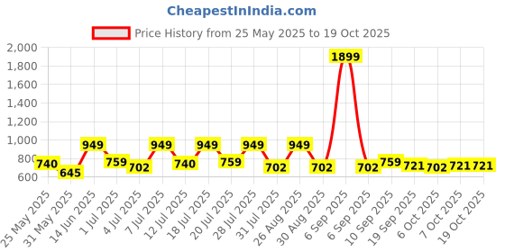 The current price is ₹721, which is ₹76 (11.8%) higher than the best price of ₹645 last seen on 31 May 2025. Over the 146 day price history period, prices have ranged from ₹645 to ₹1,899, with an average of ₹836. The pricing shows high volatility with significant fluctuations, with prices remaining relatively stable overall. In terms of recent activity, there have been 0 price changes this week, 2 this month, and 18 over the past year. If you need this product now, it's a reasonable time to buy as prices are stable, but you might want to monitor for potential better deals.