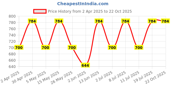 The current price is ₹784, which is ₹140 (21.7%) higher than the best price of ₹644 last seen on 2 Jun 2025. Over the 202 day price history period, prices have ranged from ₹644 to ₹784, with an average of ₹737. The pricing shows moderate volatility, but the overall trend is concerning as prices are getting more expensive. In terms of recent activity, there have been 0 price changes this week, 0 this month, and 10 over the past year. If you need this product now, it's a reasonable time to buy as prices are stable, but you might want to monitor for potential better deals.