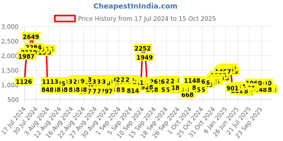 The current price is ₹848, which is ₹180 (26.9%) higher than the best price of ₹668 last seen on 28 Sep 2024. Over the 455 day price history period, prices have ranged from ₹668 to ₹2,649, with an average of ₹1,143. The pricing shows high volatility with significant fluctuations, and the overall trend is favorable for consumers as prices are getting cheaper. In terms of recent activity, there have been 0 price changes this week, 4 this month, and 29 over the past year. If you need this product now, it's a reasonable time to buy as prices are stable, but you might want to monitor for potential better deals.
