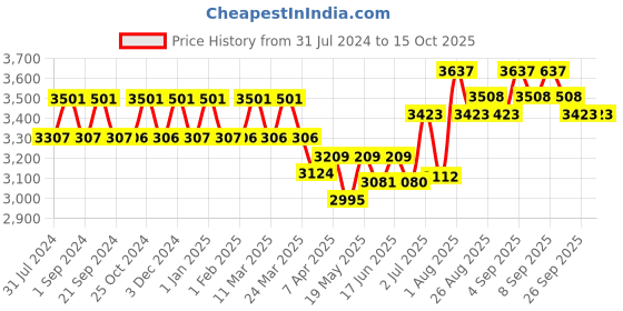 The current price is ₹3,423.2, which is ₹428.2 (14.3%) higher than the best price of ₹2,995 last seen on 16 May 2025. Over the 440 day price history period, prices have ranged from ₹2,995 to ₹3,637.15, with an average of ₹3,365. The pricing has been quite stable with low volatility, with prices remaining relatively stable overall. In terms of recent activity, there have been 0 price changes this week, 0 this month, and 28 over the past year. If you need this product now, it's a reasonable time to buy as prices are stable, but you might want to monitor for potential better deals.