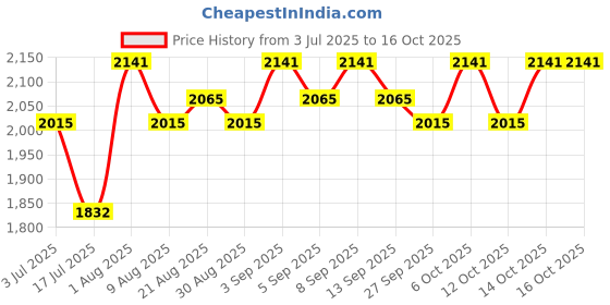 The current price is ₹2,141.15, which is ₹309.15 (16.9%) higher than the best price of ₹1,832 last seen on 17 Jul 2025. Over the 104 day price history period, prices have ranged from ₹1,832 to ₹2,141.15, with an average of ₹2,063. The pricing has been quite stable with low volatility, but the overall trend is concerning as prices are getting more expensive. In terms of recent activity, there has been 1 price change this week, 3 this month, and 13 over the past year. Consider waiting before making a purchase as prices are rising and better deals may be available later.