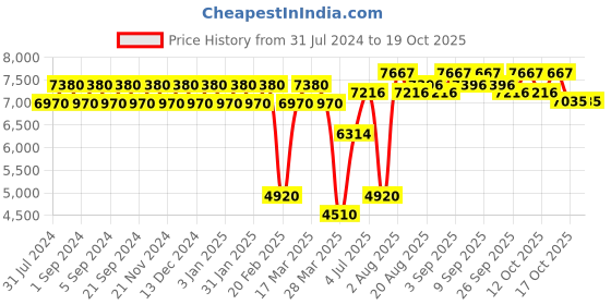 The current price is ₹7,035.6, which is ₹2,525.6 (56.0%) higher than the best price of ₹4,510 last seen on 28 Mar 2025. Over the 444 day price history period, prices have ranged from ₹4,510 to ₹7,667, with an average of ₹7,038. The pricing shows moderate volatility, with prices remaining relatively stable overall. In terms of recent activity, there have been 2 price changes this week, 4 this month, and 29 over the past year. The price direction is uncertain, so monitor the situation for a few more days before making a decision.