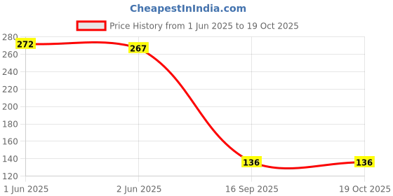 Fantastic! The current price of ₹136 is at its best ever level. Over the 139 day price history period, prices have ranged from ₹136 to ₹272, with an average of ₹203. The pricing shows high volatility with significant fluctuations, and the overall trend is favorable for consumers as prices are getting cheaper. In terms of recent activity, there have been 0 price changes this week, 0 this month, and 2 over the past year. This is an excellent time to make a purchase as prices are trending downward and conditions appear favorable.