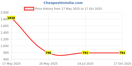 Great news for shoppers! The current price of ₹791 is at its best ever level. Over the 152 day price history period, prices have ranged from ₹791 to ₹1,838, with an average of ₹1,054. The pricing shows high volatility with significant fluctuations, and the overall trend is favorable for consumers as prices are getting cheaper. In terms of recent activity, there have been 0 price changes this week, 0 this month, and 2 over the past year. If you need this product now, it's a reasonable time to buy as prices are stable, but you might want to monitor for potential better deals.