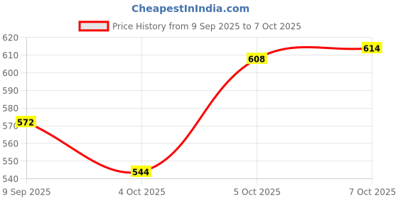 The current price is ₹614, which is ₹70 (12.9%) higher than the best price of ₹544 last seen on 4 Oct 2025. Over the 28 day price history period, prices have ranged from ₹544 to ₹614, with an average of ₹585. The pricing has been quite stable with low volatility, but the overall trend is concerning as prices are getting more expensive. In terms of recent activity, there have been 0 price changes this week, 2 this month, and 3 over the past year. If you need this product now, it's a reasonable time to buy as prices are stable, but you might want to monitor for potential better deals.