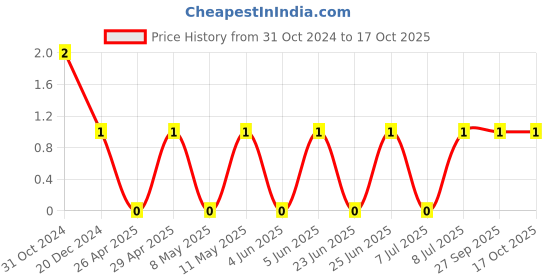 The current price is ₹1.01, which is ₹0.3 (42.3%) higher than the best price of ₹0.71 last seen on 26 Apr 2025. Over the 350 day price history period, prices have ranged from ₹0.71 to ₹2, with an average of ₹1. The pricing shows high volatility with significant fluctuations, and the overall trend is favorable for consumers as prices are getting cheaper. In terms of recent activity, there have been 0 price changes this week, 0 this month, and 12 over the past year. If you need this product now, it's a reasonable time to buy as prices are stable, but you might want to monitor for potential better deals.
