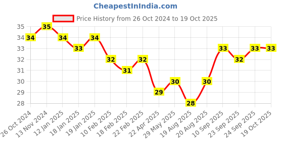 The current price is ₹33, which is ₹5 (17.9%) higher than the best price of ₹28 last seen on 19 Aug 2025. Over the 357 day price history period, prices have ranged from ₹28 to ₹35, with an average of ₹32. The pricing shows moderate volatility, with prices remaining relatively stable overall. In terms of recent activity, there have been 0 price changes this week, 1 this month, and 14 over the past year. If you need this product now, it's a reasonable time to buy as prices are stable, but you might want to monitor for potential better deals.