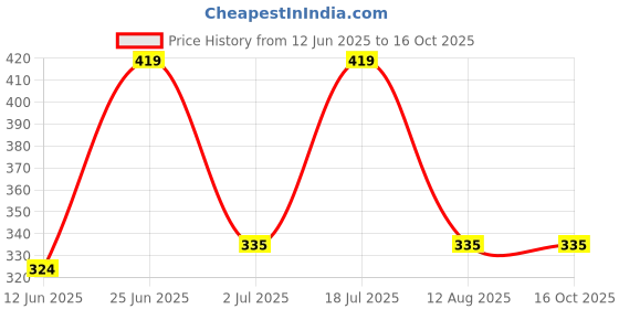 The current price is ₹335, which is ₹11 (3.4%) higher than the best price of ₹324 last seen on 12 Jun 2025. Over the 126 day price history period, prices have ranged from ₹324 to ₹419, with an average of ₹361. The pricing shows moderate volatility, with prices remaining relatively stable overall. In terms of recent activity, there have been 0 price changes this week, 0 this month, and 4 over the past year. If you need this product now, it's a reasonable time to buy as prices are stable, but you might want to monitor for potential better deals.