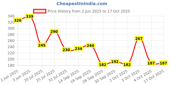 The current price is ₹187, which is ₹5 (2.7%) higher than the best price of ₹182 last seen on 28 Sep 2025. Over the 136 day price history period, prices have ranged from ₹182 to ₹339, with an average of ₹239. The pricing shows high volatility with significant fluctuations, and the overall trend is favorable for consumers as prices are getting cheaper. In terms of recent activity, there have been 0 price changes this week, 5 this month, and 11 over the past year. If you need this product now, it's a reasonable time to buy as prices are stable, but you might want to monitor for potential better deals.