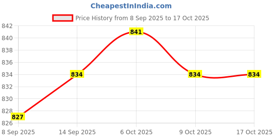 The current price is ₹834, which is ₹7 (0.8%) higher than the best price of ₹827 last seen on 8 Sep 2025. Over the 38 day price history period, prices have ranged from ₹827 to ₹841, with an average of ₹834. The pricing has been quite stable with low volatility, with prices remaining relatively stable overall. In terms of recent activity, there have been 0 price changes this week, 1 this month, and 3 over the past year. If you need this product now, it's a reasonable time to buy as prices are stable, but you might want to monitor for potential better deals.