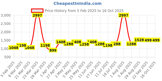 The current price is ₹1,499, which is ₹600 (66.7%) higher than the best price of ₹899 last seen on 1 Apr 2025. Over the 253 day price history period, prices have ranged from ₹899 to ₹2,997, with an average of ₹1,460. The pricing shows high volatility with significant fluctuations, but the overall trend is concerning as prices are getting more expensive. In terms of recent activity, there have been 0 price changes this week, 0 this month, and 17 over the past year. If you need this product now, it's a reasonable time to buy as prices are stable, but you might want to monitor for potential better deals.