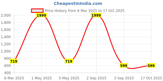 Great news for shoppers! The current price of ₹599 is at its best ever level. Over the 224 day price history period, prices have ranged from ₹599 to ₹1,999, with an average of ₹1,106. The pricing shows high volatility with significant fluctuations, and the overall trend is favorable for consumers as prices are getting cheaper. In terms of recent activity, there have been 0 price changes this week, 0 this month, and 4 over the past year. This is an excellent time to make a purchase as prices are trending downward and conditions appear favorable.