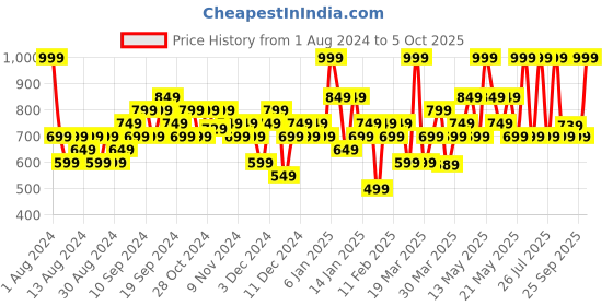 The current price is ₹999, which is ₹500 (100.2%) higher than the best price of ₹499 last seen on 21 Jan 2025. Over the 430 day price history period, prices have ranged from ₹499 to ₹999, with an average of ₹748. The pricing shows high volatility with significant fluctuations, with prices remaining relatively stable overall. In terms of recent activity, there have been 0 price changes this week, 2 this month, and 50 over the past year. The price direction is uncertain, so monitor the situation for a few more days before making a decision.