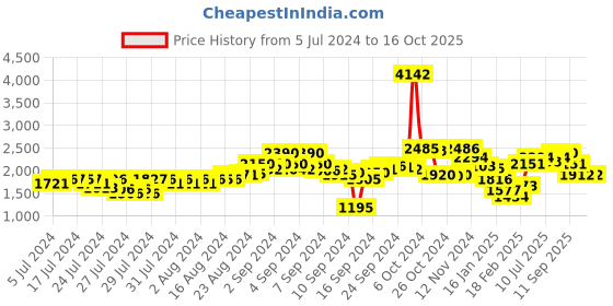The current price is ₹1,912, which is ₹717 (60.0%) higher than the best price of ₹1,195 last seen on 10 Sep 2024. Over the 468 day price history period, prices have ranged from ₹1,195 to ₹4,142, with an average of ₹1,970. The pricing shows high volatility with significant fluctuations, but the overall trend is concerning as prices are getting more expensive. In terms of recent activity, there have been 0 price changes this week, 0 this month, and 17 over the past year. The price direction is uncertain, so monitor the situation for a few more days before making a decision.