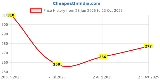 The current price is ₹277, which is ₹19 (7.4%) higher than the best price of ₹258 last seen on 7 Jul 2025. Over the 117 day price history period, prices have ranged from ₹258 to ₹310, with an average of ₹278. The pricing shows moderate volatility, and the overall trend is favorable for consumers as prices are getting cheaper. In terms of recent activity, there have been 0 price changes this week, 0 this month, and 3 over the past year. If you need this product now, it's a reasonable time to buy as prices are stable, but you might want to monitor for potential better deals.