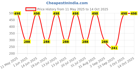 The current price is ₹498, which is ₹257 (106.6%) higher than the best price of ₹241 last seen on 23 Sep 2025. Over the 155 day price history period, prices have ranged from ₹241 to ₹498, with an average of ₹397. The pricing shows high volatility with significant fluctuations, with prices remaining relatively stable overall. In terms of recent activity, there have been 0 price changes this week, 1 this month, and 11 over the past year. The price direction is uncertain, so monitor the situation for a few more days before making a decision.
