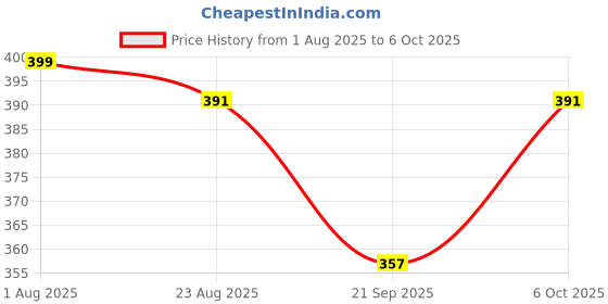 The current price is ₹391, which is ₹34 (9.5%) higher than the best price of ₹357 last seen on 21 Sep 2025. Over the 66 day price history period, prices have ranged from ₹357 to ₹399, with an average of ₹385. The pricing has been quite stable with low volatility, with prices remaining relatively stable overall. In terms of recent activity, there have been 0 price changes this week, 1 this month, and 3 over the past year. If you need this product now, it's a reasonable time to buy as prices are stable, but you might want to monitor for potential better deals.