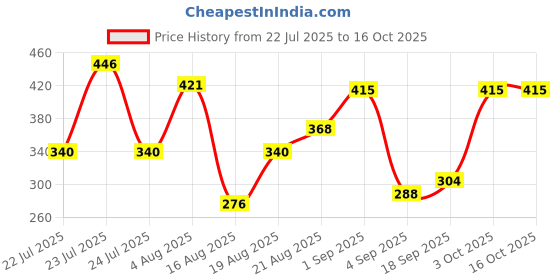 The current price is ₹415, which is ₹139 (50.4%) higher than the best price of ₹276 last seen on 16 Aug 2025. Over the 86 day price history period, prices have ranged from ₹276 to ₹446, with an average of ₹364. The pricing shows high volatility with significant fluctuations, but the overall trend is concerning as prices are getting more expensive. In terms of recent activity, there have been 0 price changes this week, 1 this month, and 10 over the past year. Consider waiting before making a purchase as prices are rising and better deals may be available later.