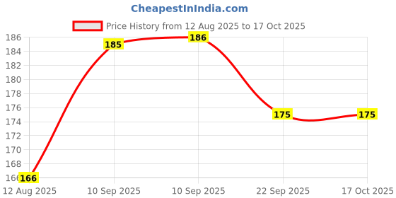 The current price is ₹175, which is ₹9 (5.4%) higher than the best price of ₹166 last seen on 12 Aug 2025. Over the 65 day price history period, prices have ranged from ₹166 to ₹186, with an average of ₹177. The pricing has been quite stable with low volatility, but the overall trend is concerning as prices are getting more expensive. In terms of recent activity, there have been 0 price changes this week, 0 this month, and 3 over the past year. If you need this product now, it's a reasonable time to buy as prices are stable, but you might want to monitor for potential better deals.