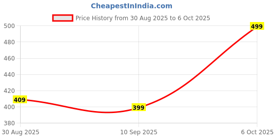 The current price is ₹499, which is ₹100 (25.1%) higher than the best price of ₹399 last seen on 10 Sep 2025. Over the 37 day price history period, prices have ranged from ₹399 to ₹499, with an average of ₹436. The pricing shows moderate volatility, but the overall trend is concerning as prices are getting more expensive. In terms of recent activity, there have been 0 price changes this week, 1 this month, and 2 over the past year. If you need this product now, it's a reasonable time to buy as prices are stable, but you might want to monitor for potential better deals.