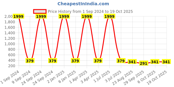 The current price is ₹341, which is ₹50 (17.2%) higher than the best price of ₹291 last seen on 29 Sep 2025. Over the 412 day price history period, prices have ranged from ₹291 to ₹1,999, with an average of ₹943. The pricing shows high volatility with significant fluctuations, and the overall trend is favorable for consumers as prices are getting cheaper. In terms of recent activity, there have been 0 price changes this week, 1 this month, and 8 over the past year. If you need this product now, it's a reasonable time to buy as prices are stable, but you might want to monitor for potential better deals.