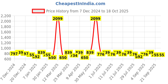 The current price is ₹755, which is ₹105 (16.2%) higher than the best price of ₹650 last seen on 1 Mar 2025. Over the 315 day price history period, prices have ranged from ₹650 to ₹2,099, with an average of ₹868. The pricing shows high volatility with significant fluctuations, and the overall trend is favorable for consumers as prices are getting cheaper. In terms of recent activity, there have been 0 price changes this week, 0 this month, and 26 over the past year. If you need this product now, it's a reasonable time to buy as prices are stable, but you might want to monitor for potential better deals.