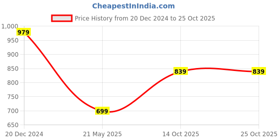 The current price is ₹839, which is ₹140 (20.0%) higher than the best price of ₹699 last seen on 21 May 2025. Over the 308 day price history period, prices have ranged from ₹699 to ₹979, with an average of ₹839. The pricing shows moderate volatility, and the overall trend is favorable for consumers as prices are getting cheaper. In terms of recent activity, there have been 0 price changes this week, 0 this month, and 2 over the past year. The price direction is uncertain, so monitor the situation for a few more days before making a decision.