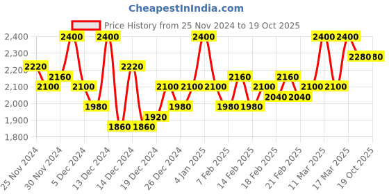 The current price is ₹2,280, which is ₹420 (22.6%) higher than the best price of ₹1,860 last seen on 13 Dec 2024. Over the 327 day price history period, prices have ranged from ₹1,860 to ₹2,400, with an average of ₹2,135. The pricing shows moderate volatility, with prices remaining relatively stable overall. In terms of recent activity, there have been 0 price changes this week, 0 this month, and 27 over the past year. The price direction is uncertain, so monitor the situation for a few more days before making a decision.