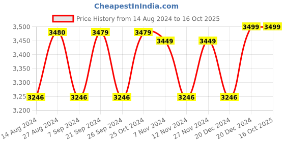 The current price is ₹3,499, which is ₹253 (7.8%) higher than the best price of ₹3,246 last seen on 14 Aug 2024. Over the 427 day price history period, prices have ranged from ₹3,246 to ₹3,499, with an average of ₹3,380. The pricing has been quite stable with low volatility, but the overall trend is concerning as prices are getting more expensive. In terms of recent activity, there have been 0 price changes this week, 0 this month, and 5 over the past year. Consider waiting before making a purchase as prices are rising and better deals may be available later.