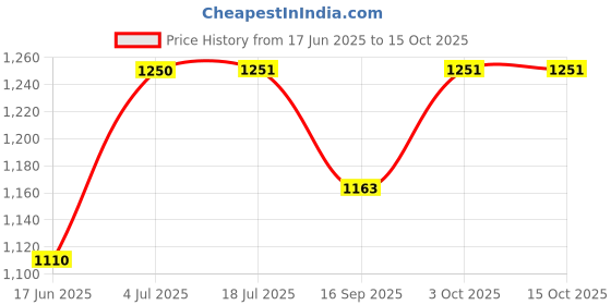 The current price is ₹1,251, which is ₹141 (12.7%) higher than the best price of ₹1,110 last seen on 17 Jun 2025. Over the 119 day price history period, prices have ranged from ₹1,110 to ₹1,251, with an average of ₹1,213. The pricing has been quite stable with low volatility, but the overall trend is concerning as prices are getting more expensive. In terms of recent activity, there have been 0 price changes this week, 1 this month, and 4 over the past year. If you need this product now, it's a reasonable time to buy as prices are stable, but you might want to monitor for potential better deals.