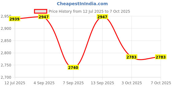The current price is ₹2,783, which is ₹43 (1.6%) higher than the best price of ₹2,740 last seen on 7 Sep 2025. Over the 86 day price history period, prices have ranged from ₹2,740 to ₹2,947, with an average of ₹2,857. The pricing has been quite stable with low volatility, and the overall trend is favorable for consumers as prices are getting cheaper. In terms of recent activity, there have been 0 price changes this week, 2 this month, and 4 over the past year. This is an excellent time to make a purchase as prices are trending downward and conditions appear favorable.