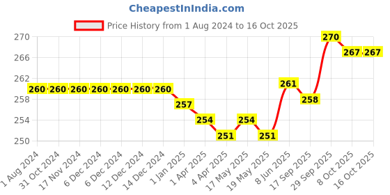 The current price is ₹267, which is ₹15.84 (6.3%) higher than the best price of ₹251.16 last seen on 4 Apr 2025. Over the 441 day price history period, prices have ranged from ₹251.16 to ₹270, with an average of ₹259. The pricing has been quite stable with low volatility, with prices remaining relatively stable overall. In terms of recent activity, there have been 0 price changes this week, 2 this month, and 14 over the past year. If you need this product now, it's a reasonable time to buy as prices are stable, but you might want to monitor for potential better deals.
