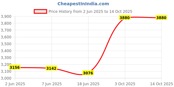 The current price is ₹3,880, which is ₹804 (26.1%) higher than the best price of ₹3,076 last seen on 18 Jun 2025. Over the 133 day price history period, prices have ranged from ₹3,076 to ₹3,880, with an average of ₹3,427. The pricing shows moderate volatility, but the overall trend is concerning as prices are getting more expensive. In terms of recent activity, there have been 0 price changes this week, 0 this month, and 3 over the past year. Consider waiting before making a purchase as prices are rising and better deals may be available later.