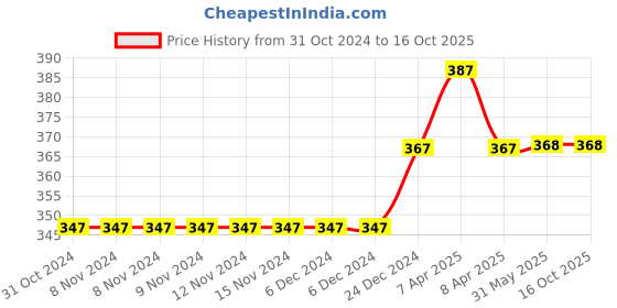 The current price is ₹368, which is ₹21 (6.1%) higher than the best price of ₹347 last seen on 31 Oct 2024. Over the 349 day price history period, prices have ranged from ₹347 to ₹387.03, with an average of ₹356. The pricing has been quite stable with low volatility, but the overall trend is concerning as prices are getting more expensive. In terms of recent activity, there have been 0 price changes this week, 0 this month, and 11 over the past year. If you need this product now, it's a reasonable time to buy as prices are stable, but you might want to monitor for potential better deals.