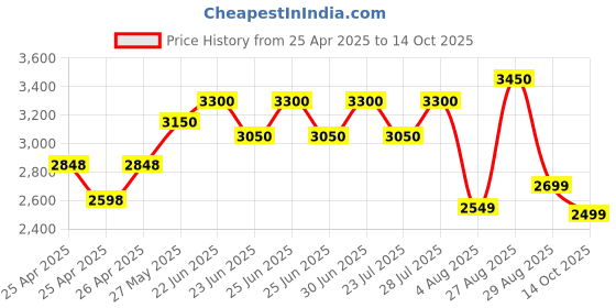 Awesome! The current price of ₹2,499 is at its best ever level. Over the 172 day price history period, prices have ranged from ₹2,499 to ₹3,450, with an average of ₹2,999. The pricing shows moderate volatility, and the overall trend is favorable for consumers as prices are getting cheaper. In terms of recent activity, there have been 0 price changes this week, 0 this month, and 14 over the past year. This is an excellent time to make a purchase as prices are trending downward and conditions appear favorable.