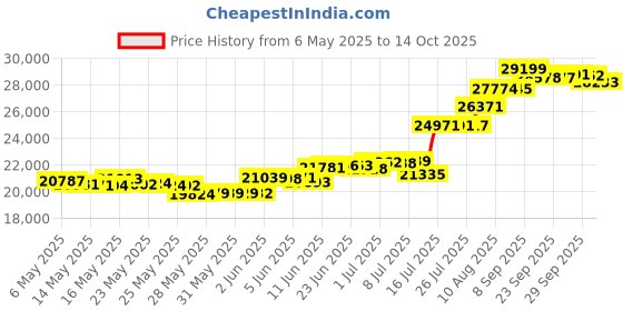 The current price is ₹28,233, which is ₹8,409 (42.4%) higher than the best price of ₹19,824 last seen on 27 May 2025. Over the 161 day price history period, prices have ranged from ₹19,824 to ₹29,199, with an average of ₹22,984. The pricing shows moderate volatility, but the overall trend is concerning as prices are getting more expensive. In terms of recent activity, there have been 0 price changes this week, 4 this month, and 37 over the past year. The price direction is uncertain, so monitor the situation for a few more days before making a decision.