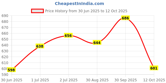 The current price is ₹601, which is ₹3 (0.5%) higher than the best price of ₹598 last seen on 30 Jun 2025. Over the 104 day price history period, prices have ranged from ₹598 to ₹686, with an average of ₹637. The pricing has been quite stable with low volatility, with prices remaining relatively stable overall. In terms of recent activity, there have been 0 price changes this week, 1 this month, and 5 over the past year. If you need this product now, it's a reasonable time to buy as prices are stable, but you might want to monitor for potential better deals.