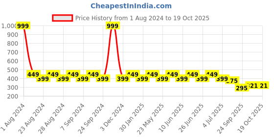 The current price is ₹321, which is ₹26 (8.8%) higher than the best price of ₹295 last seen on 24 Sep 2025. Over the 443 day price history period, prices have ranged from ₹295 to ₹999, with an average of ₹454. The pricing shows high volatility with significant fluctuations, and the overall trend is favorable for consumers as prices are getting cheaper. In terms of recent activity, there have been 0 price changes this week, 1 this month, and 14 over the past year. If you need this product now, it's a reasonable time to buy as prices are stable, but you might want to monitor for potential better deals.