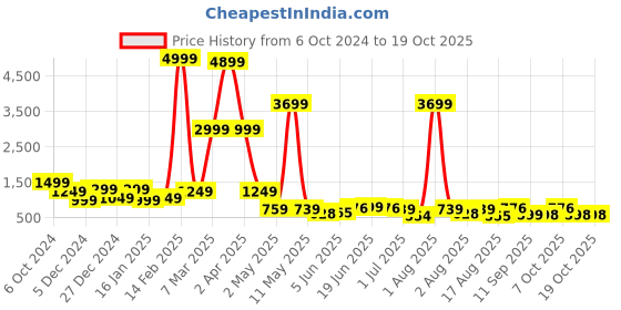 The current price is ₹598, which is ₹44 (7.9%) higher than the best price of ₹554 last seen on 5 Jul 2025. Over the 377 day price history period, prices have ranged from ₹554 to ₹4,999, with an average of ₹1,379. The pricing shows high volatility with significant fluctuations, and the overall trend is favorable for consumers as prices are getting cheaper. In terms of recent activity, there have been 0 price changes this week, 2 this month, and 32 over the past year. This is an excellent time to make a purchase as prices are trending downward and conditions appear favorable.