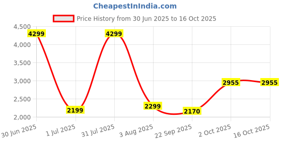 The current price is ₹2,955, which is ₹785 (36.2%) higher than the best price of ₹2,170 last seen on 22 Sep 2025. Over the 108 day price history period, prices have ranged from ₹2,170 to ₹4,299, with an average of ₹3,025. The pricing shows high volatility with significant fluctuations, and the overall trend is favorable for consumers as prices are getting cheaper. In terms of recent activity, there have been 0 price changes this week, 1 this month, and 5 over the past year. The price direction is uncertain, so monitor the situation for a few more days before making a decision.