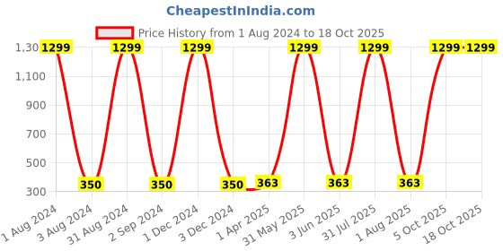 The current price is ₹1,299, which is ₹949 (271.1%) higher than the best price of ₹350 last seen on 3 Aug 2024. Over the 443 day price history period, prices have ranged from ₹350 to ₹1,299, with an average of ₹864. The pricing shows high volatility with significant fluctuations, with prices remaining relatively stable overall. In terms of recent activity, there have been 0 price changes this week, 0 this month, and 7 over the past year. The price direction is uncertain, so monitor the situation for a few more days before making a decision.