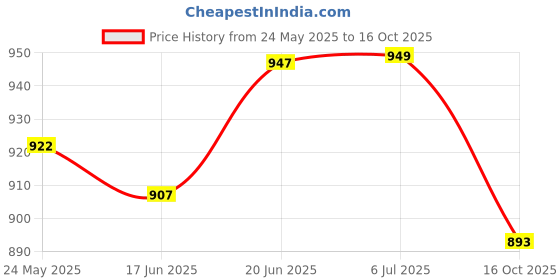 Exciting update! The current price of ₹893 is at its best ever level. Over the 145 day price history period, prices have ranged from ₹893 to ₹949, with an average of ₹924. The pricing has been quite stable with low volatility, with prices remaining relatively stable overall. In terms of recent activity, there have been 0 price changes this week, 0 this month, and 4 over the past year. If you need this product now, it's a reasonable time to buy as prices are stable, but you might want to monitor for potential better deals.