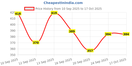 The current price is ₹384, which is ₹27 (7.6%) higher than the best price of ₹357 last seen on 20 Sep 2025. Over the 36 day price history period, prices have ranged from ₹357 to ₹419, with an average of ₹389. The pricing shows moderate volatility, and the overall trend is favorable for consumers as prices are getting cheaper. In terms of recent activity, there have been 0 price changes this week, 1 this month, and 5 over the past year. If you need this product now, it's a reasonable time to buy as prices are stable, but you might want to monitor for potential better deals.